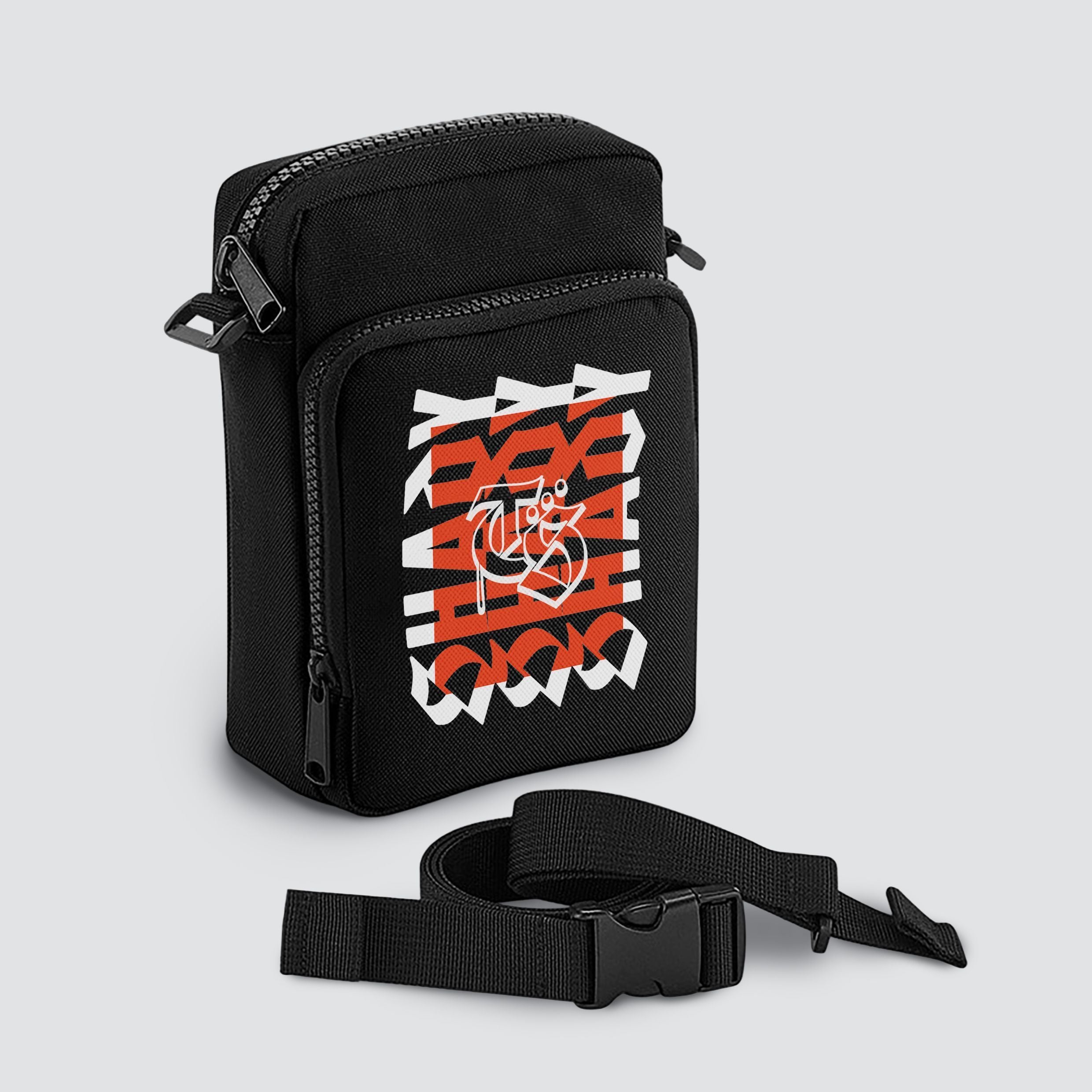 This black over-the-shoulder bag is the perfect hands-free essential for festivals, clubs, and everyday streetwear. Designed with an adjustable webbing shoulder strap for a custom fit, it features a zippered main compartment and a secure zippered front pocket to keep your essentials organised.